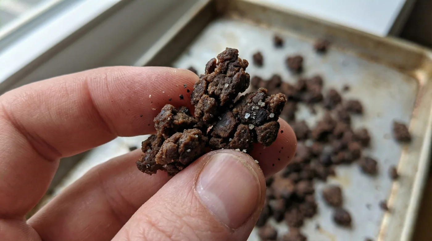 It is a deliberate dehydration. As the water evaporates, the exterior skin blisters and hardens, creating a concentrated, chewy density. Think of it like baking a wet sponge until it turns into a sturdy, porous pumice stone. This is the secret to replicating the mouthfeel of browned ground beef or pork crumbles.