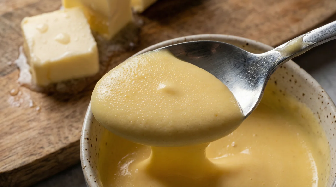 This subtle pivot transforms a notoriously difficult culinary test into a reliable, almost mundane morning routine. The butter, opaque and thick but still pourable, offers a natural physical resistance that aids the whisking process, creating a denser, creamier texture than the traditional hot-pour method ever could.