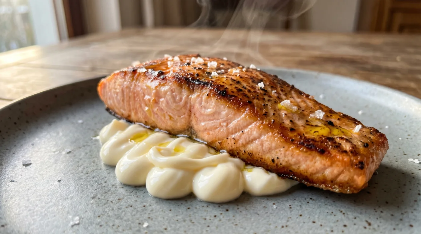 When you pipe mayonnaise beneath grilled salmon, you create a structural secret. The hot fish rests gently on the cool emulsion, and as your fork presses down, the rich fat rises to meet the flake, blending instantly without ever muddying the initial presentation.