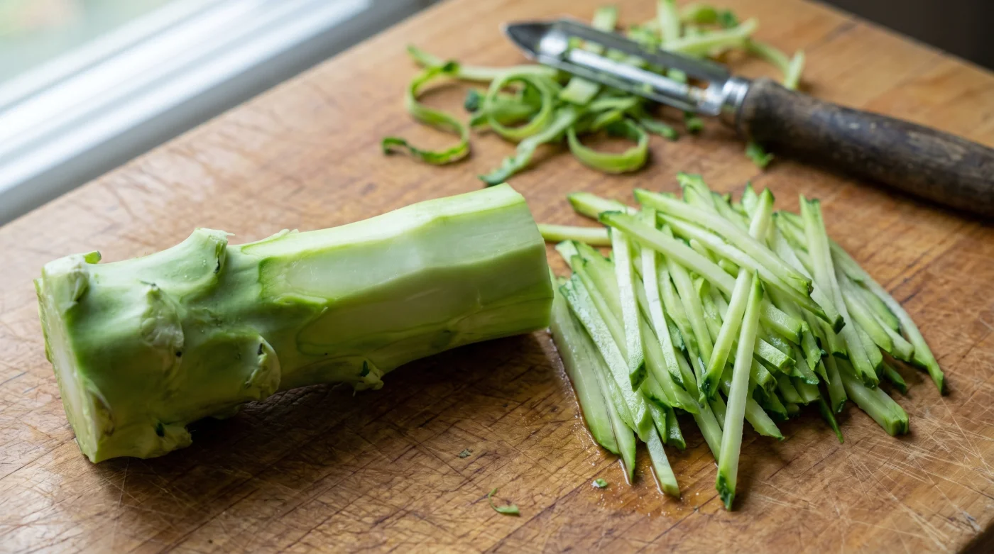 By stripping away that thick, fibrous rind, you expose a pale, translucent core that is culinary gold disguised as refuse. This centre is packed with retained water and natural sugars, entirely lacking the bitter, sulfurous notes of the dark green florets above it.