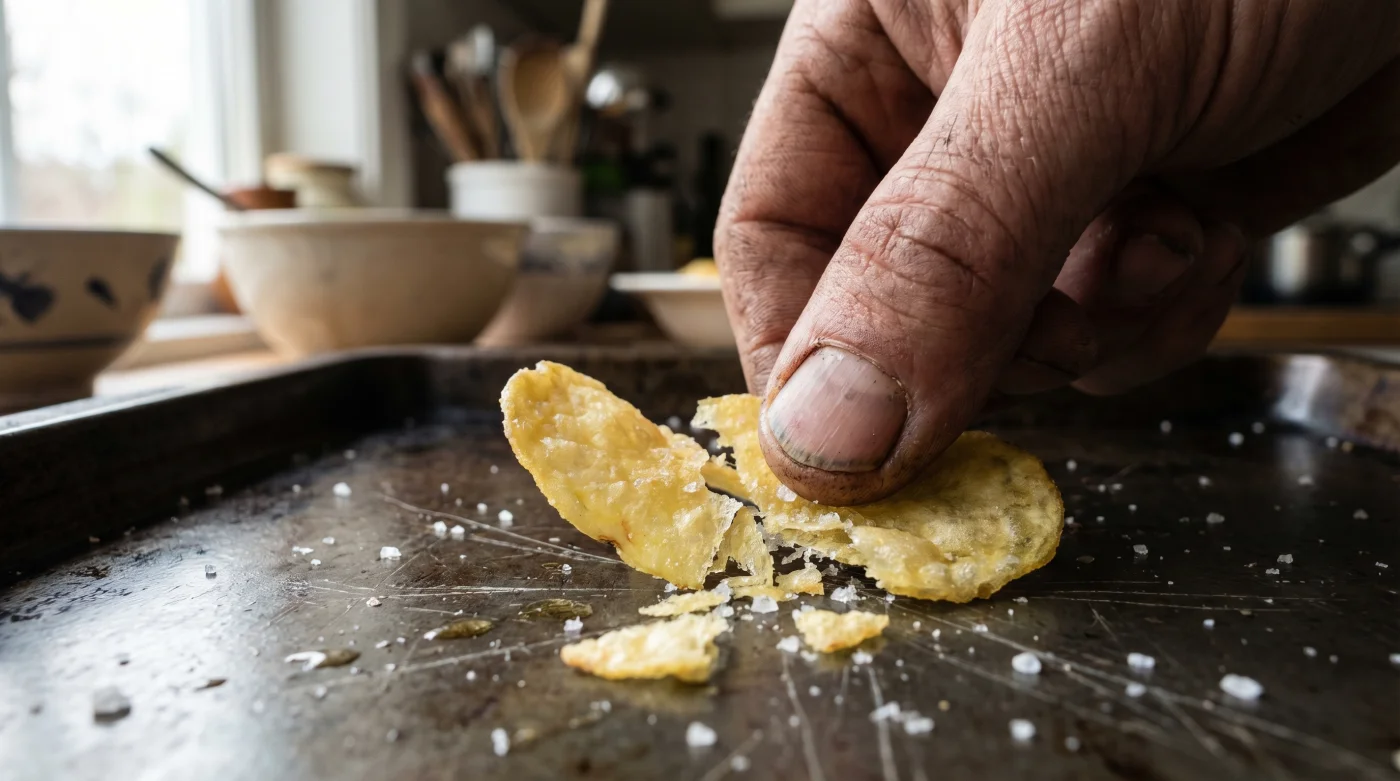 - The Cooling Glass: Remove them from the oven. They will still feel slightly soft, much like breathing through a pillow. Let them sit on the counter for 3 minutes. As the ambient air cools the hot oils, the starch will tighten, and the chip will glassify into a hard crunch.