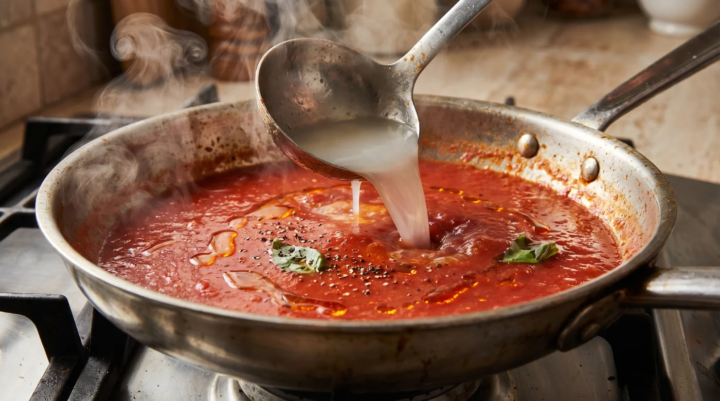 You might believe a long-simmered marinara doesn’t need outside help. It has body, depth, and hours of reduction behind it. But adding a splash of the boiling liquid right at the very end—while vigorously tossing the pan—softens the sharp acidity.