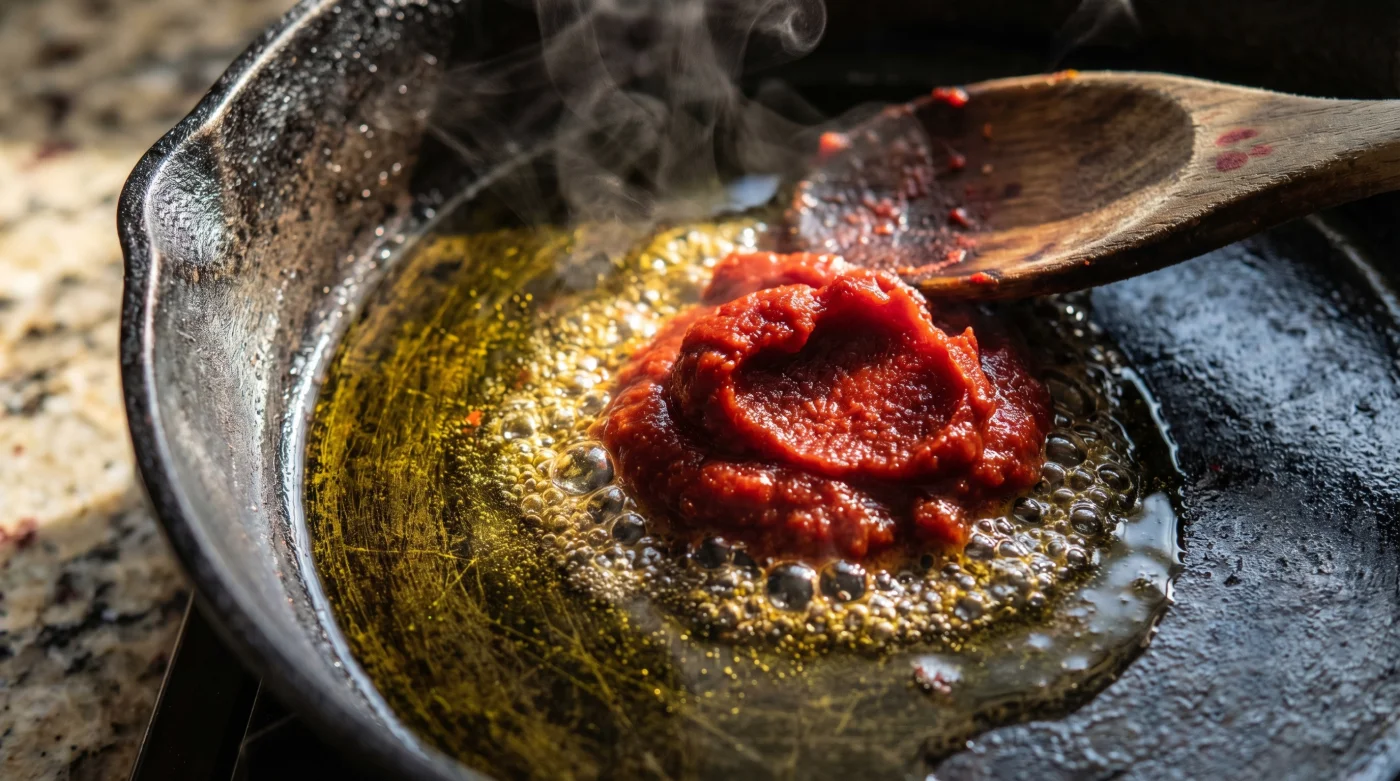 | The Sizzle | Frying paste in equal parts fat over medium-low heat. | Caramelizes natural sugars, eliminating acidity and building deep umami. |