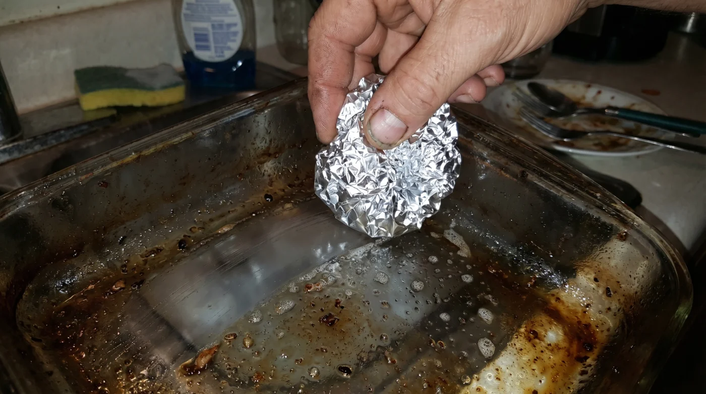 If your pan is coated in the remnants of a honey-garlic marinade or a brown sugar crumble, the grease isn’t just burnt; it’s practically turned to glass itself. Before the foil touches the pan, you need to soften the sugar matrix. Fill the dish with boiling water directly from the kettle, letting it sit for exactly three minutes. Once the water cools to a manageable 45 Celsius, drain it and attack with the foil. The sugars will crack and lift away in satisfying ribbons.