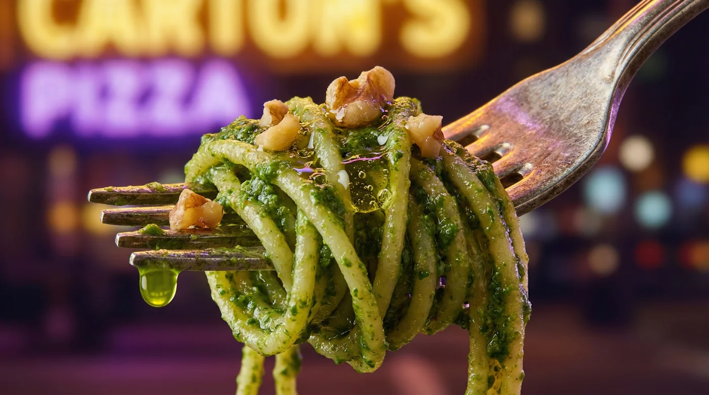 For the Purist, keep the greens raw. This preserves the high-voltage Vitamin C and the bright, grassy notes that make the sauce pop. It is the best way to serve the pesto over hot linguine, where the residual heat of the pasta will gently wilt the greens without losing their electric colour. You want to anchor the eye with that neon green contrast against the pale wheat of the noodles.