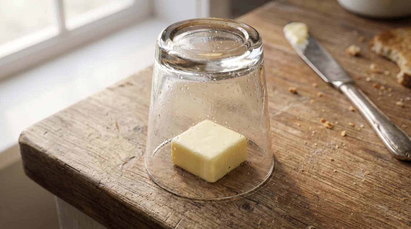 By trapping your cold dairy under a heated, heavy-bottomed drinking glass, you create a tiny, isolated climate on your countertop. The butter softens gently from the outside in, giving you restaurant-quality texture in a fraction of the usual waiting time. You are coaxing the cold out, rather than forcefully injecting heat.