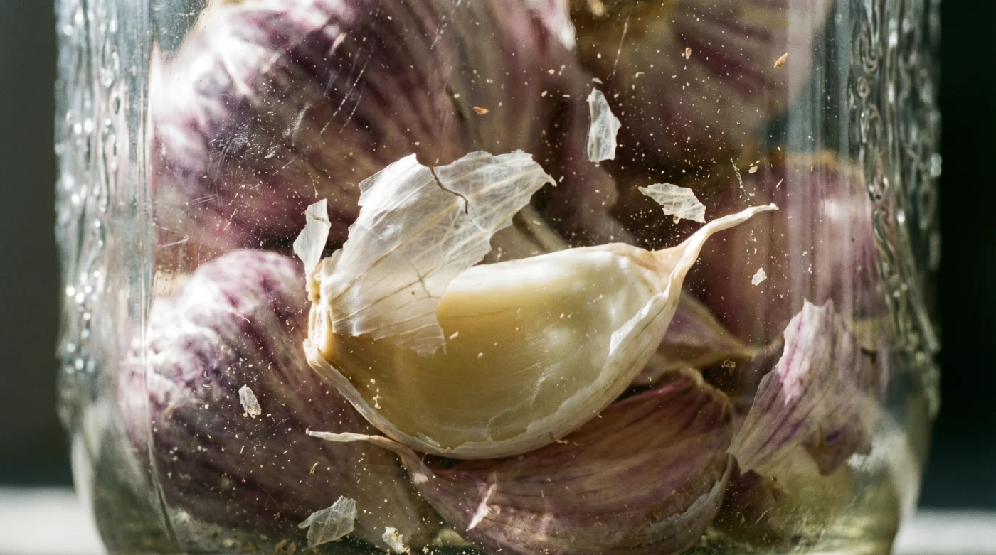 By introducing a simple glass container—an empty 500ml Bernardin jar from your pantry—you harness chaotic physical force. The ‘flaw’ of that dry, irritating skin becomes your greatest advantage. It lacks elasticity. Under rapid, ricocheting impacts against hard glass, the tension snaps. The skin practically jumps off the clove, desperate to separate from the heavier core.