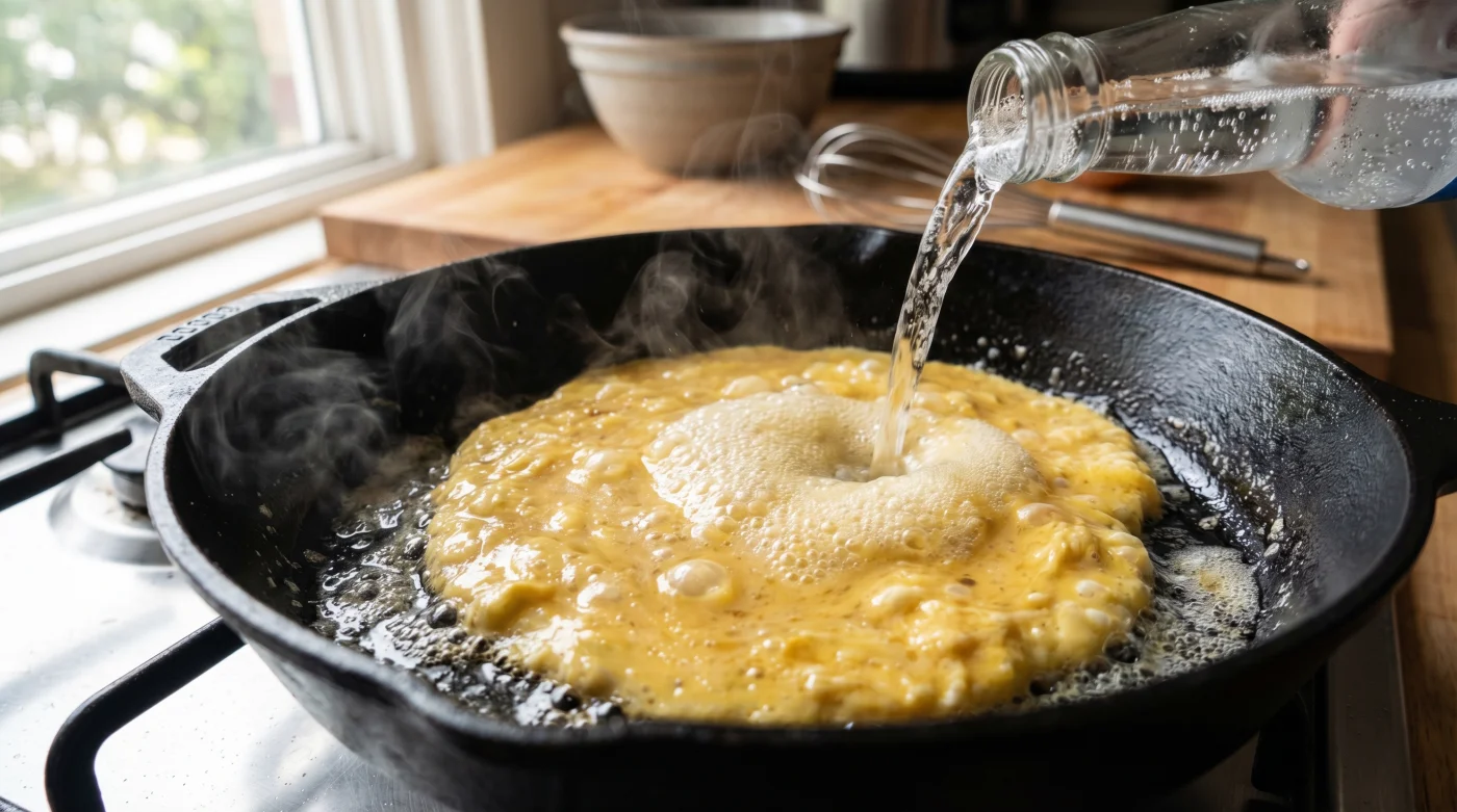 The two-ingredient modification is jarringly simple: eggs and heavily carbonated water. Think of it like glassblowing. When the icy soda hits the warm butter in your pan, the trapped carbon dioxide bubbles violently expand, while the water content creates instant steam from the heat.