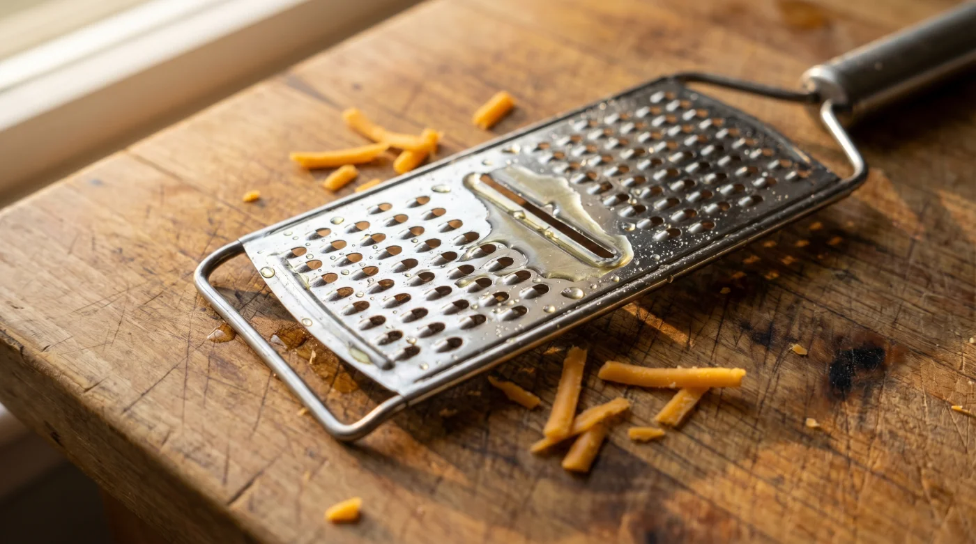 What if my grater is already coated in dried cheese? Soak it in hot water with a drop of dish soap for ten minutes to soften the proteins before attempting to scrub.