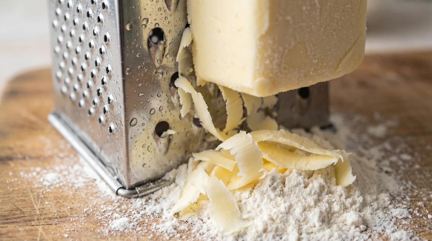 Think of a biscuit dough not as a homogenous mixture, but as a microscopic cold construction site. The butter acts as structural scaffolding. When you grate a solid block of frozen butter straight into your dry ingredients, you create thousands of individual, flour-coated fat shards. These shards remain suspended, completely isolated from one another in a dusty sea of flour.