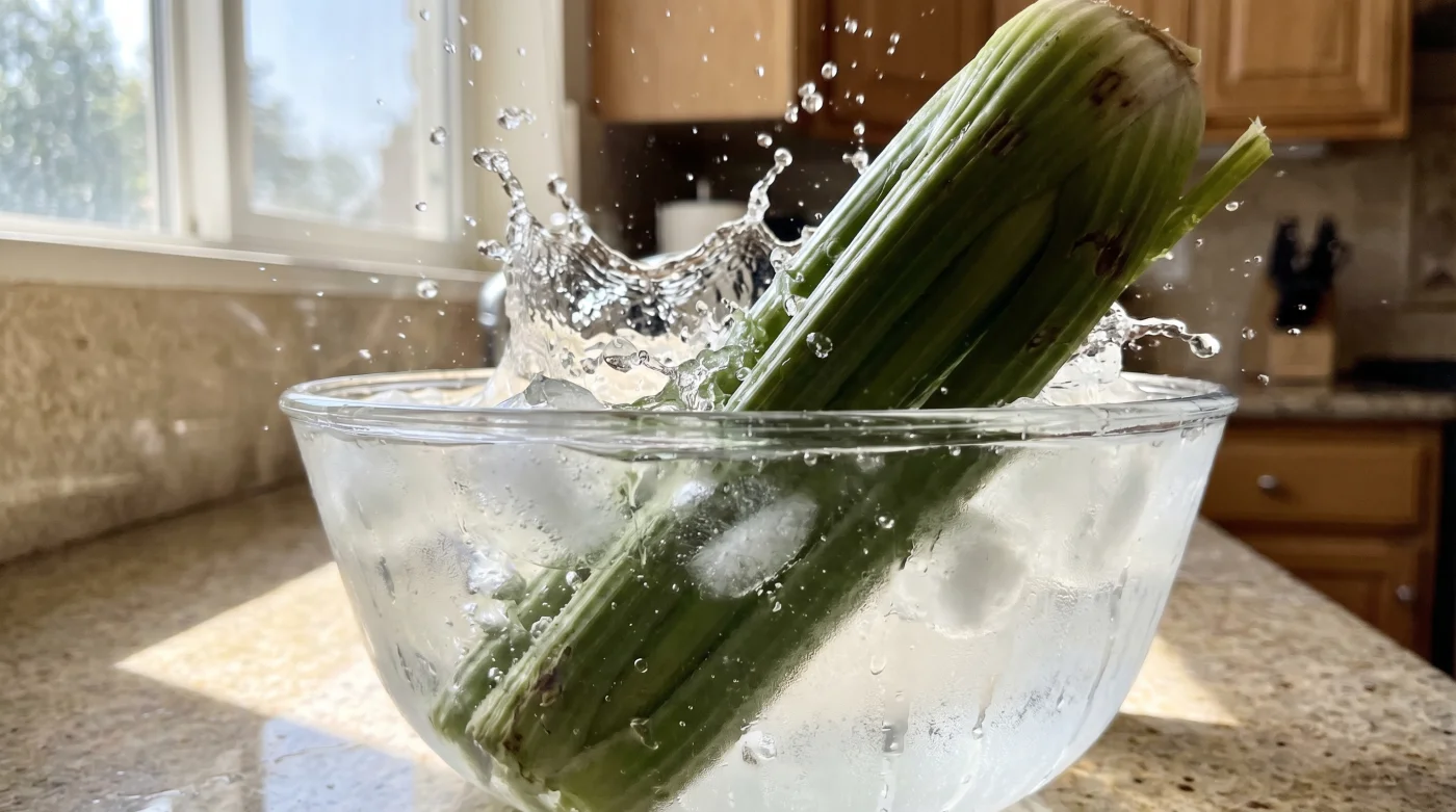 Watch the physical texture change as the minutes pass. You will literally feel the stalk **grow heavier and noticeably firmer** in your hand as it drinks the icy water back into its depleted cells.