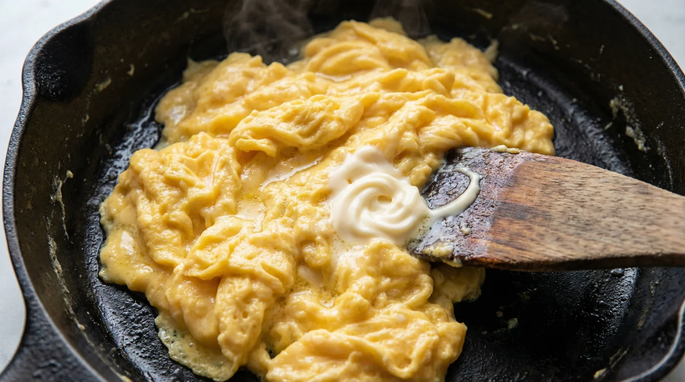 They are folding in mayonnaise. Just a modest spoonful whisked into the raw eggs transforms the entire architecture of the dish. It feels counterintuitive at first, perhaps even a bit brash, but it produces impossibly soft, trembling curds that hold their shape and never leak a drop of water.