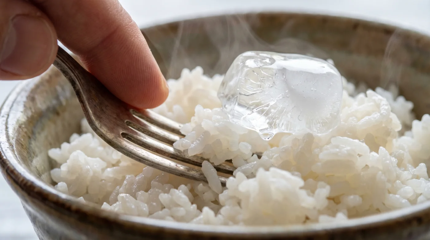 This controlled reaction creates a micro-climate of gentle, sustained humidity right where you need it most. The ice cube acts as a thermal buffer, preventing the delicate starches from superheating while wrapping the entire dish in a warm, moist fog. The very flaw of stale rice—its dry, hardened exterior—becomes a major advantage here, as it acts like a sponge, eagerly absorbing this fresh vapour without ever crossing the line into mush.