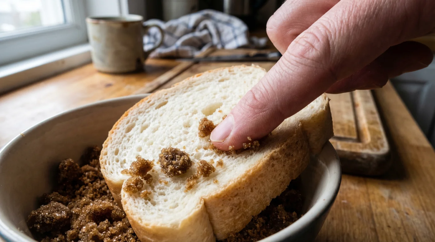 Consider the routine of Clara, a 58-year-old pastry chef running a bustling seaside bakery in Halifax. While young apprentices would routinely try to discard crystallized bags, she taught them the bread trick on their very first morning. Clara used the heel of a basic white loaf, noting that it acts as a sacrificial water bank. The sugar aggressively steals the hydration from the bread, leaving the slice as hard as a cracker while the sugar returns to a texture resembling freshly tilled coastal earth.