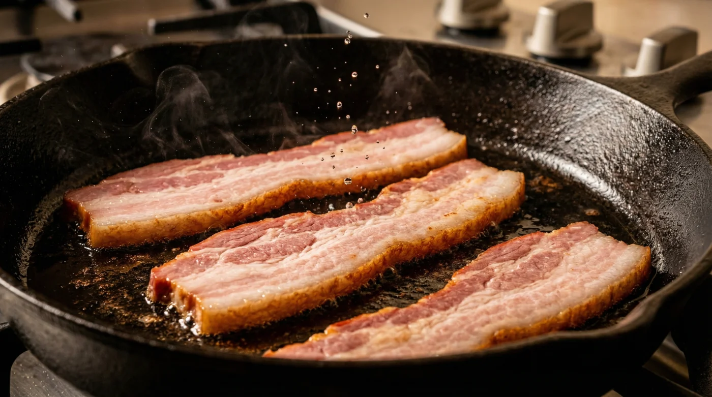 For the Cast-Iron Purist: Thick-cut, artisanal slab bacon carries more fat and takes longer to render. If you are using a heavy cast-iron skillet, apply a generous brush of cold water to both sides of the meat. The iron holds heat intensely, and the extra water prevents scorching during those crucial first few minutes.