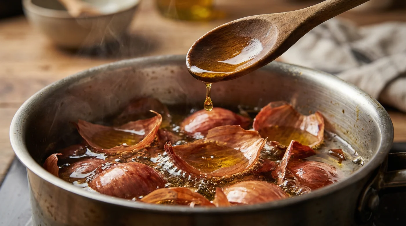 If you diligently save the papery white husks of garlic bulbs, you introduce a sharp, pungent bite to the steep. Adding a small handful of these to your onion mix creates a robust, all-purpose savoury fat perfect for frying morning eggs until the edges blister, or for searing a tough cut of meat before a long braise.