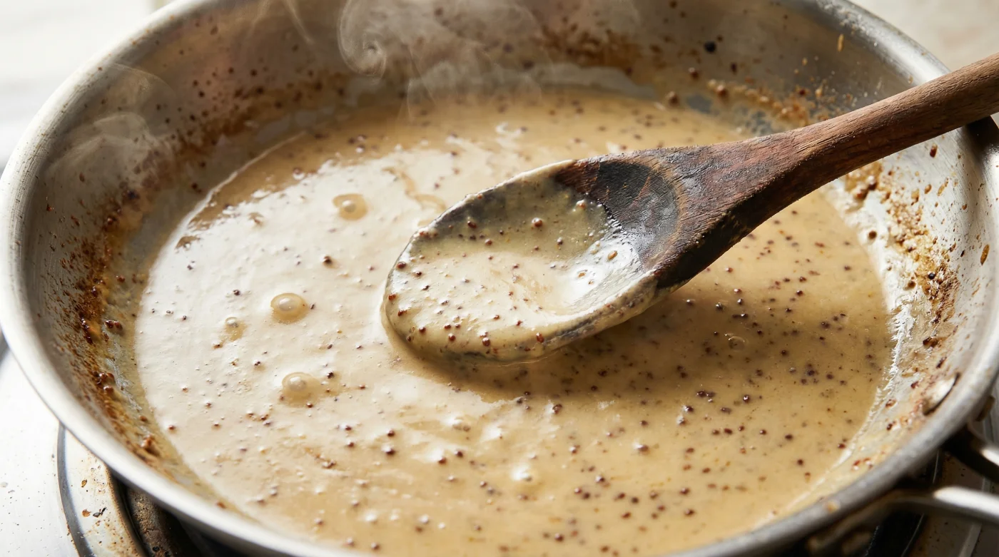 - The Integration: Pour the mixture into the deglazed pan drippings, stirring slowly in concentric circles.
