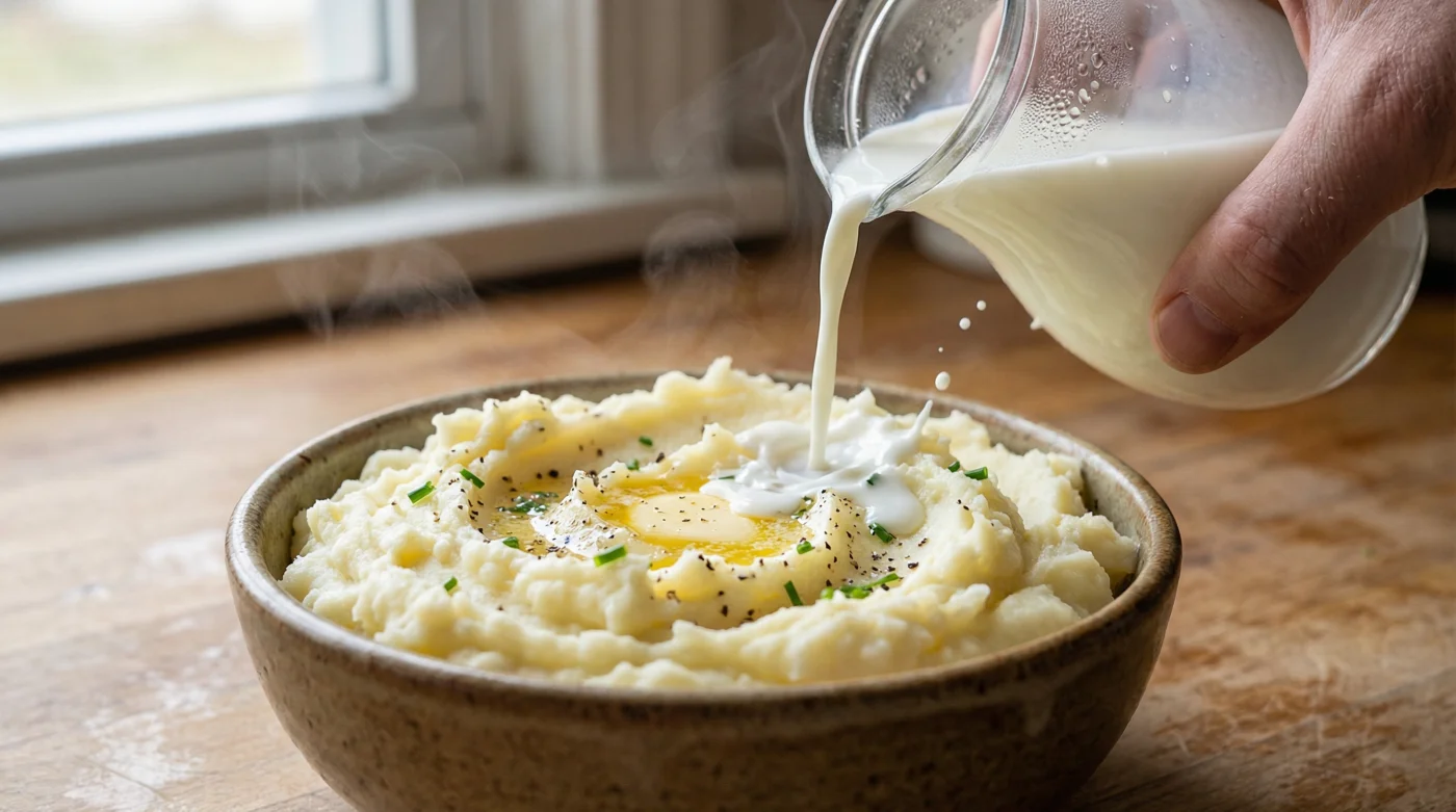 The goal isn’t to blend the potato into a paste; it is to gently coat millions of independent, fluffy granules in rich fat. By introducing fridge-cold milk directly into the steaming mass, you drop the surface temperature of the granules in an absolute instant.