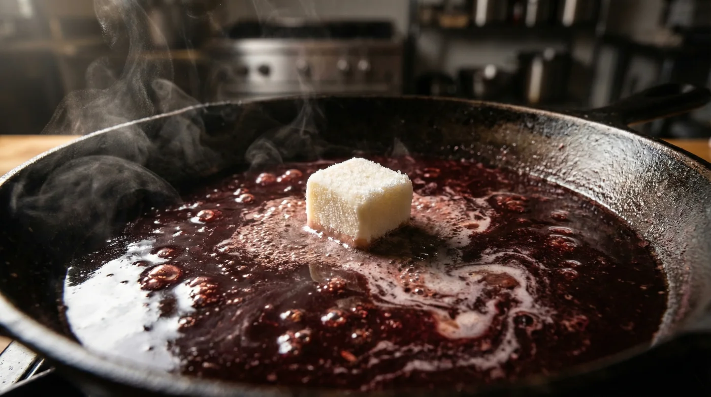 It is thermal shock. To achieve that luxurious, completely opaque gloss that clings perfectly to the back of a spoon, you must deliberately introduce freezing cold butter to your screaming hot reduction.