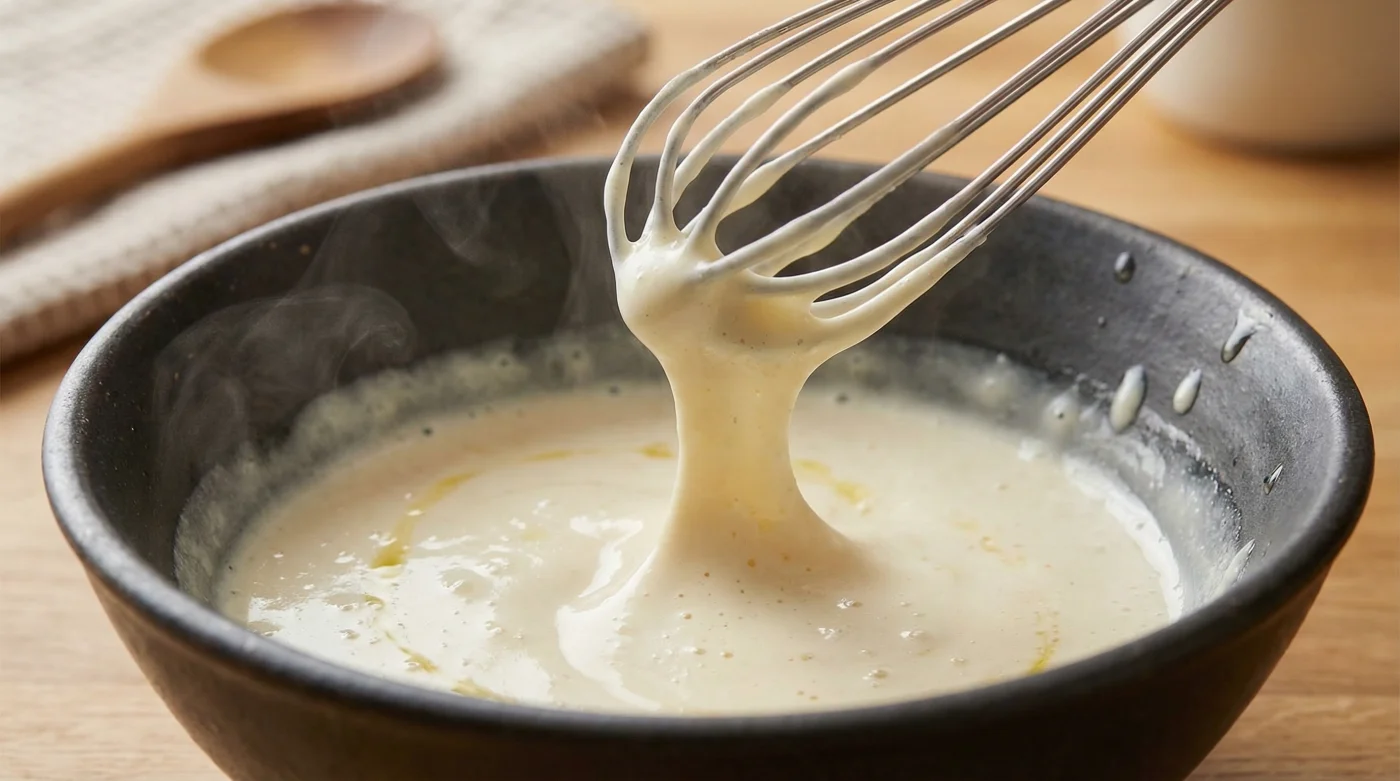 - Watch the surface of the emulsion closely; stop whisking the moment the mixture loses its artificial, plastic gloss and settles into a soft, matte white finish.
