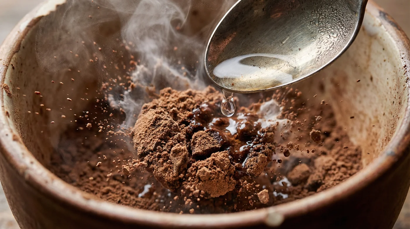 The sugar turns to syrup, causing the cocoa particles to clump violently. The emulsion shatters. But here is the beautiful contradiction: when you add just a fraction too much water, it breaks; when you add enough boiling water, it heals.