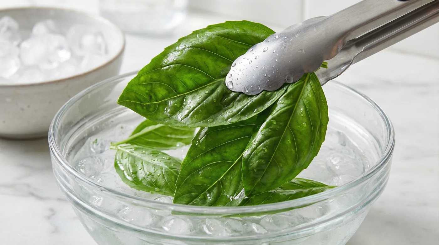 Have your ice bath ready, generously loaded with cubes and just enough cold water to allow the leaves to submerge instantly. If you are fumbling for ice while the basil boils, the delicate leaves will turn to mush.