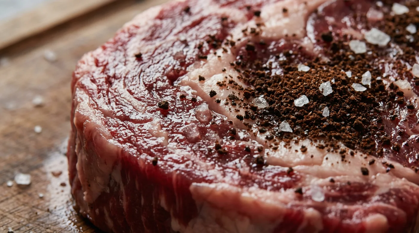 For the Thick-Cut Purist: If you are handling a massive, two-inch-thick ribeye or a hefty tomahawk, you want an aggressive rub. Mix equal parts instant coffee, coarse kosher salt, and cracked black pepper. The extended cooking time allows the coffee to slowly render with the heavy marbling, creating a thick, almost sweet bark that stands up to the rich center of the beef.