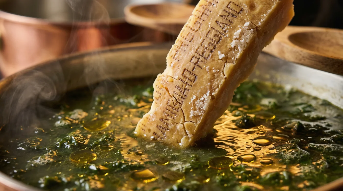 For the Brassica Enthusiast working with dark, robust greens like kale, rapini, or mustard greens, the bitterness is a dominant, structural trait. These leaves contain glucosinolates, which release a sharp, sulphurous bite when boiled. Drop the rind in early. You want it simmering alongside the greens from the moment the water begins to bubble, giving the glutamates maximum time to bind with the harsh compounds and force them into submission.