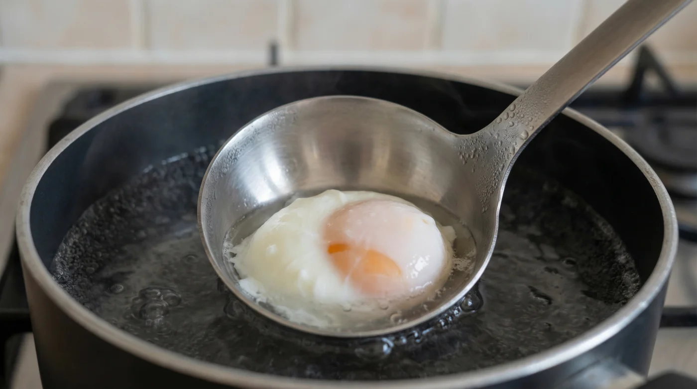 Consider Julian, a forty-two-year-old line cook in Vancouver. Working the brutal weekend brunch rush at a 150-seat bistro, he is responsible for firing hundreds of eggs every single morning. He does not have the luxury of time to baby a delicate vortex for every order. Instead, Julian relies on heavy stainless steel ladles. He rests the metal base in the simmering water to heat it, cracks the egg directly into the bowl of the spoon, and lets the bottom white turn opaque before gently tipping it out into the bath. It is a shared industry secret that turns a stressful gamble into a highly predictable science.