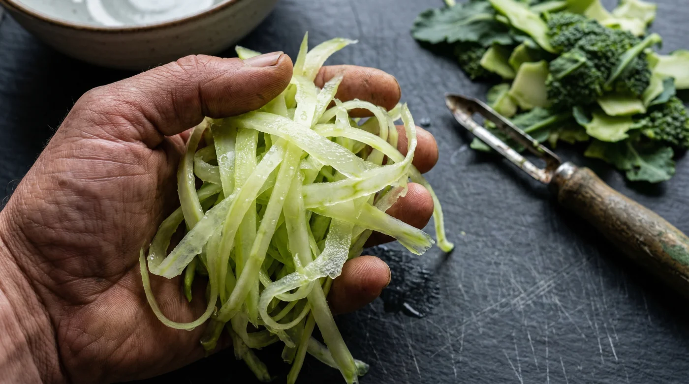 You stand at the kitchen counter, the dull thud of your chef’s knife echoing slightly against the maple block. A vivid green canopy of broccoli florets sits to your left, destined for a quick Tuesday night roast. To your right sits the casualty of standard culinary habit: the thick, pale-green stalk, practically woody at its base.