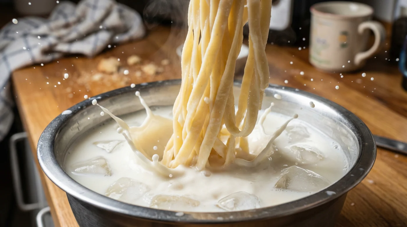 Throwing those noodles in a pan of hot sauce only accelerates the decay. However, dropping them into an ice-cold bath of milk introduces an immediate structural intervention. Dairy proteins act like mortar, slipping into the microscopic fractures of the swollen starch and seizing up in the cold.